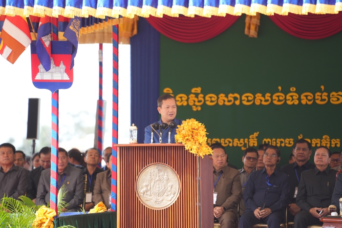 柬埔寨首相洪瑪奈向集團下屬企業國機重型裝備集團股份有限公司董事長韓曉軍交付截流石。柬埔寨能源與礦產部部長高拉達那、柬埔寨國公省省長密杜娜·布通、中國駐柬埔寨大使王文天、中國駐柬使館經商處參贊鐘潔等中柬政要,中柬主流媒體與社會各界人士等1800余人,共同見證這一中柬務實合作、增進民生福祉項目建設取得突破性進展的歷史時刻。